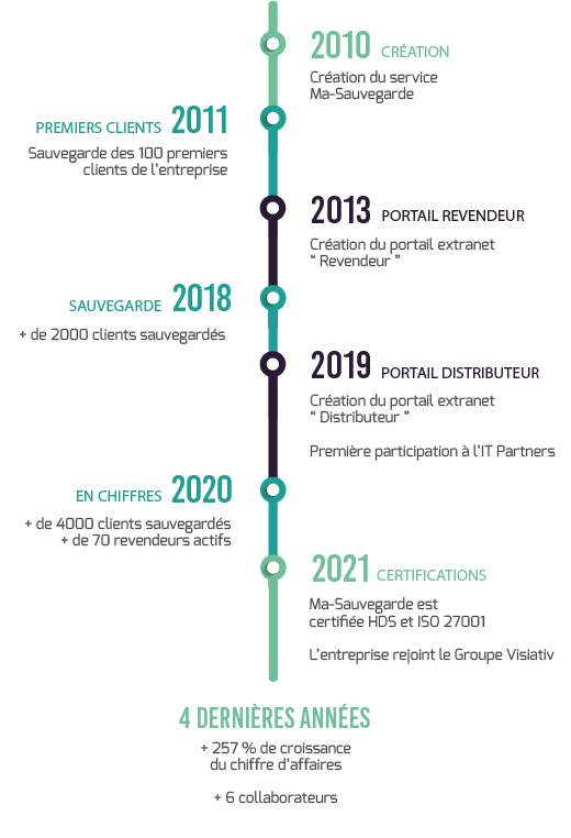 Tout commence en 2010 avec la création du service Ma-Sauvegarde, par son fondateur Hervé Favre. Son ambition ? Proposer aux professionnels de l’informatique un service de sauvegarde externalisée totalement paramétrable, combinant un moteur de sauvegarde mature et éprouvé à des outils d’exploitation simples et intuitifs.